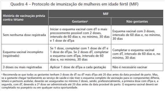 Recomenda-se que todas as gestantes tenham 3 doses de dT ou dT mais dTpa até 20 dias antes da data provável de parto. Mas, se a gestante chegar tardiamente ao serviço de saúde e não tiver o esquema completo de vacinação para os componentes difteria, tétano e pertussis acelular, deverão ser asseguradas no mínimo 2 doses, sendo, preferencialmente, a primeira dose com dTpa e, a segunda, com dT, devendo a 2ª dose ser administrada até 20 dias antes da data provável do parto. O esquema vacinal deverá ser completado no puerpério ou em qualquer outra oportunidade.