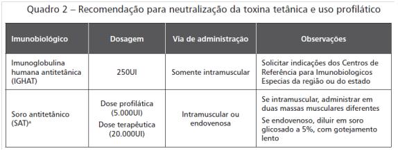 Tratamento Específico: Administração de Soro Antitetânico SAT e/ou Imunoglobulina Antitetânica IGHAT e antibioticoterapia. Ver Guia de Vigilância Epidemiológica 2014, pág.215-216.