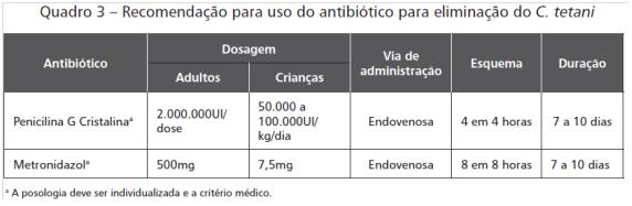 Tratamento Específico: Administração de Soro Antitetânico SAT e/ou Imunoglobulina Antitetânica IGHAT e antibioticoterapia. Ver Guia de Vigilância Epidemiológica 2014, pág.204-207.